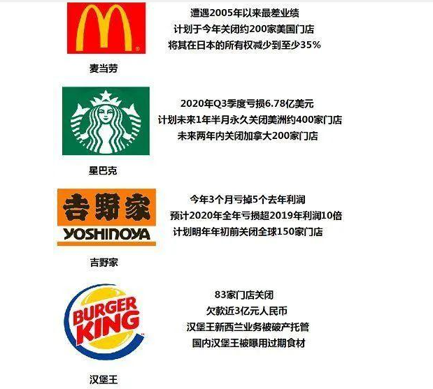 在新冠疫情的影響下,不只是吉野家關(guān)店自救,麥當(dāng)勞關(guān)店200家,星巴克關(guān)店400家……為應(yīng)對(duì)危機(jī),曾經(jīng)在全球“開疆拓土”的國(guó)際餐飲知名品牌紛紛關(guān)店。